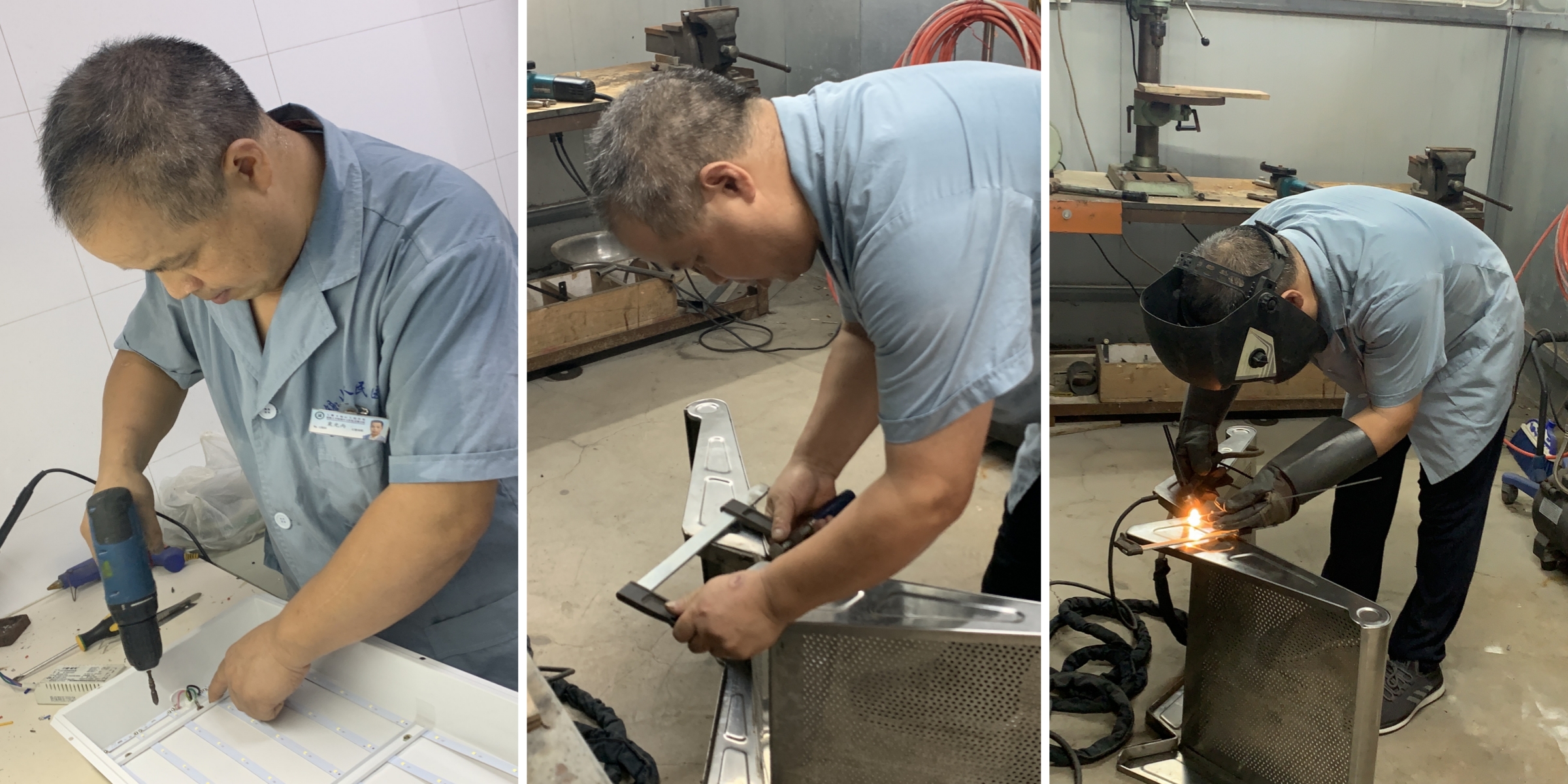 医院规模扩大的同时各种设施设备的数量也在不断增加,随着使用年限的增加,难免出现故障急需维修,如果外送到修理厂,不仅维修费用昂贵,维修周期也十分漫长,容易影响设施设备的正常使用。为了解决这些问题,粟师傅通过自学不断提高维修技能,对故障损坏的设施通过购买配件和制作配件或工具修复后再次使用,做到修旧利废、节约成本。污水处理设备和蒸汽管道噪音较大,他寻找废旧材料自己动手加工制作了两个简易消声器轻松解决了困扰已久的噪音问题;地下室提排水泵间的PLC模块因湿度高导致故障频发,维修更换费用较高,他通过现场勘查、分析原因后加装了小型除湿设备,低成本高效率地解决了隐患,保证了系统后续的安全运行;据不完全统计,在2022年他完成了病区诊室陪护椅、办公椅的维修420张、各类电器维修70余台次、灯具维修200余盏……凭借日积月累的刻苦钻研,粟师傅以严谨的工作作风、高超的工作技能,游刃有余、保质保量地完成医院每一项维修工作,既节省了经费,解决了大问题,为后续解决此类问题积累了成功的经验做法,也为医院的节能降耗、降本增效做出了一定贡献。