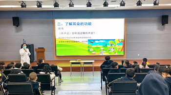 除了进社区,医护专家还走进校园。在协和国际双语学校礼堂,耳鼻咽喉科胡宏海主任医师以谜语开头,带领大家进入了“耳朵的世界”。随后,他通过轻松有趣的小游戏让孩子们认识耳朵的功能,并现场为大家检查耳朵。简单易懂的科普讲座让孩子们对保护耳朵有了更深的理解。