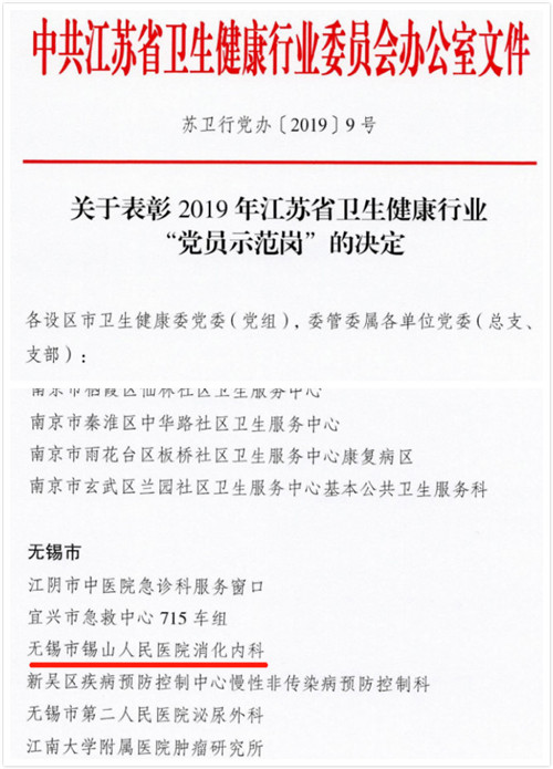 12月26日,中共江苏省卫生健康行业委员会办公室发布的2019年江苏省卫生健康行业“党员示范岗”名单中,我院消化内科光荣上榜,这是继医院荣获“江苏省文明单位”荣誉称号后,又一殊荣。