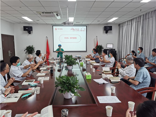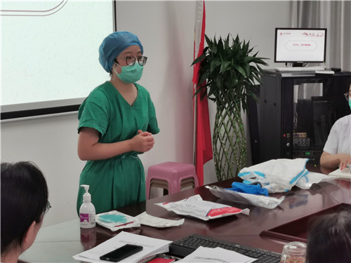 培训过程中,顾莹为大家示范了七步洗手法和隔离衣、防护服的穿脱技巧,详细讲解了防护服穿脱注意事项,她特别强调了在脱防护服的每一步都要进行“手消”,手不能触碰防护服外侧,要将脱下的防护服放入指定的黄色垃圾桶等等细节。党员们认真听,仔细看,记下防护要点,现场大家也跟着一起学习七步洗手法。