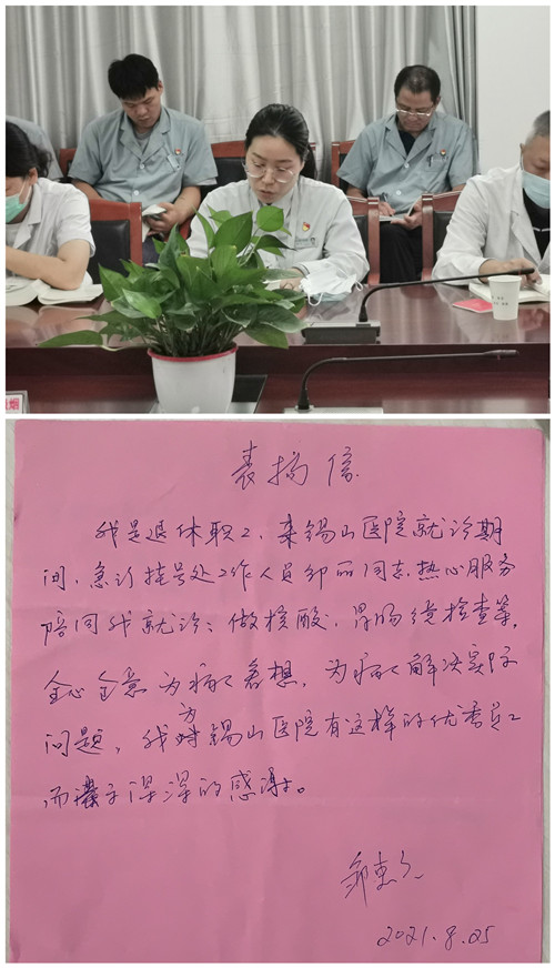 医院收费窗口作为患者就诊的主要环节,具有服务性强、沟通性强和专业性强的特点,患者希望在最短的时间里准确地办理好挂号、缴费、出入院办理等手续,“作为我们收费人员,要站在病人的立场,为他们着想;要文明用语,讲究说话技巧,微笑对待病人,让他们满意。”收费挂号处党员邹丽说道。邹丽工作已有4年,她始终牢记自己是一名共产党员,牢记自己要为人民群众服务的宗旨,工作以来,她不仅尽心尽力为病人服务,也在不断总结经验,近日,她利用休息时间,陪同一位72岁的老爷爷进行核酸检测缴费、胃肠镜检查等事宜,获得了病人的肯定,还收到了病人的感谢信。